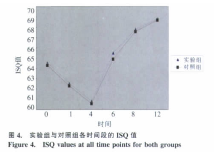 本研究显示, 早期负载组与传统负载组种植体的 ISQ 变化趋势相同, 各时间点 ISQ 值无统计学差异, 提示 ITI SLA 种植体早期负载的可行性。共振频率分析可判断种植体的稳定性。